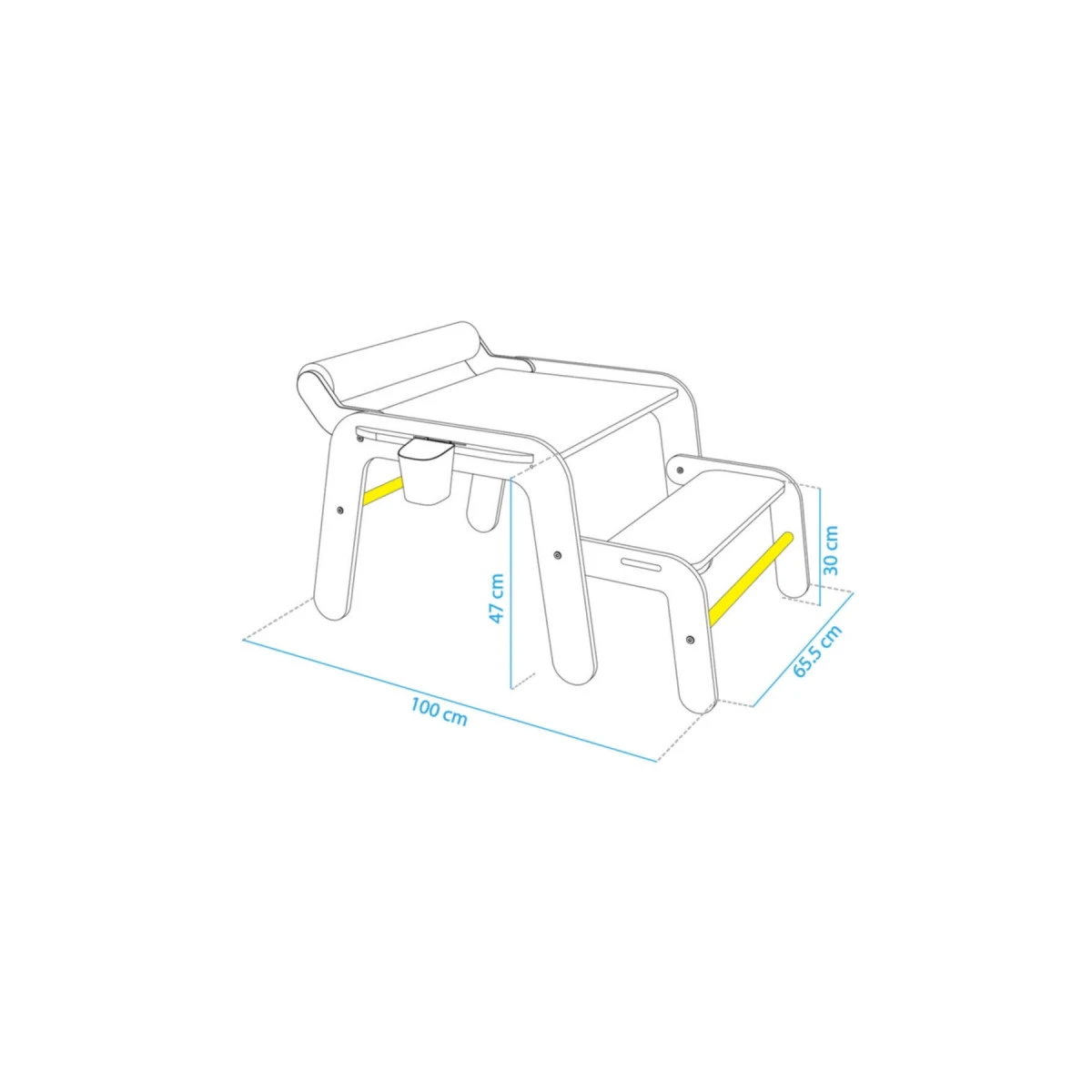 - Afmetingen: 65 x 100 x 59 cm | Zithoogte: 30 cm |Tafelhoogte: 47 cm