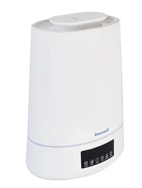 De ideale luchtvochtigheid in huis ligt tussen de 40 en 50%. Bij gebruik van verwarming en airconditioning kan het vochtgehalte in de lucht snel dalen. Dit kan leiden tot droge sinussen en een droge mond, vooral bij baby’s. Deze luchtbevochtiger van Weewell verspreid een koele waterdamp in de lucht, waardoor klachten aan de bovenste luchtwegen worden verlicht.